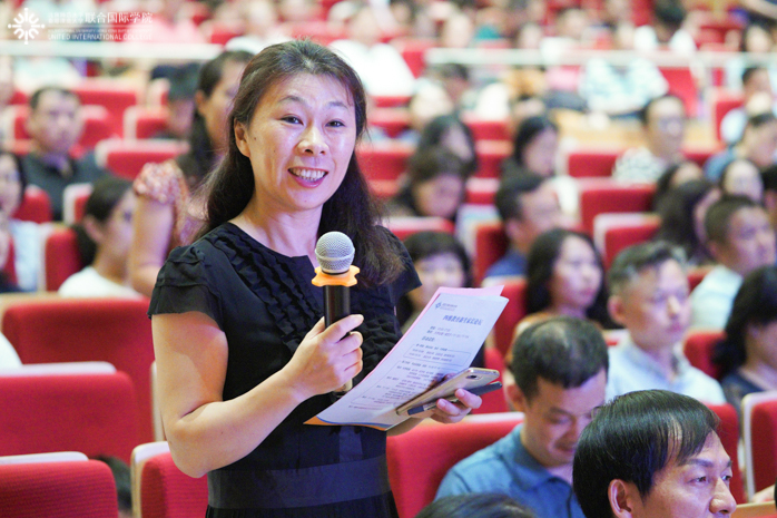 在嘉宾问答环节,一位来自黑龙江哈尔滨金融数学系刘同学的家长担心孩子不知如何应对全英文教学环境。吴志森先生建议,家长不应该太过关注和宠爱孩子,需要让他们学会独立自主,明辨是非。吴崇雅同学则表示,UIC给学生们适应成长的空间,而学校的英语课程能够帮助学生更好、更快地融入全英教学的环境;她还提到课前预习、上课专注以及认真做好每天的作业的重要性;讲到如何平衡课余以及社团活动时,她则表示应把学习放在第一位,学会规划好社团与学习的时间。