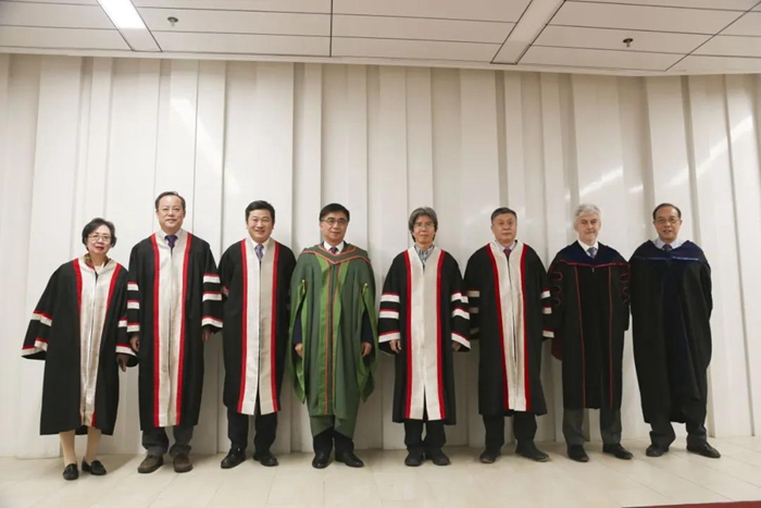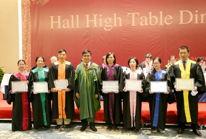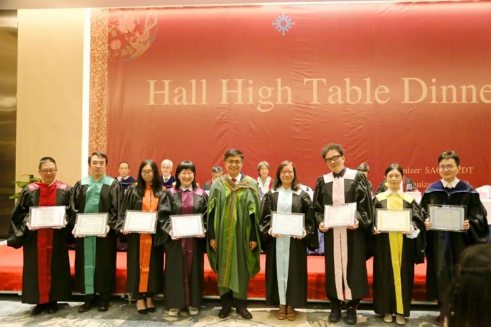 出席晚宴的高桌嘉宾(左起):协理副校长(学生发展)左龙佩兰,副校长(行政)毛亚庆,常务副校长陈致,校长汤涛,副校长(学术)黄华雄,副校长(研究和拓展)贾维嘉,协理副校长(国际发展)贝力行,财务及行政执行总裁陈立信