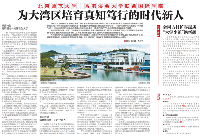 近期,《南方日报》推出“非凡十年·广东答卷”大型系列报道,今日以《北京师范大学-香港浸会大学联合国际学院:为大湾区培育真知笃行的时代新人》为题对北师港浸大(UIC)进行了专题报道,原文如下: